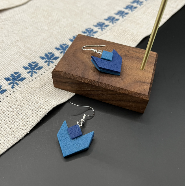 Boucles d’oreilles artisanales modernes, inspirées des symboles et motifs des tapis roumains traditionnels tissés à la main.