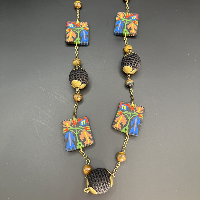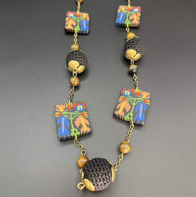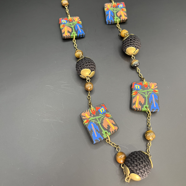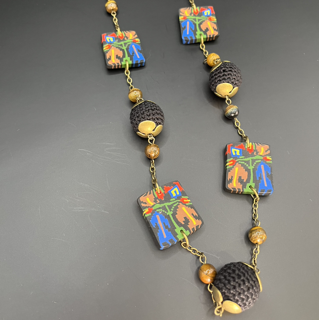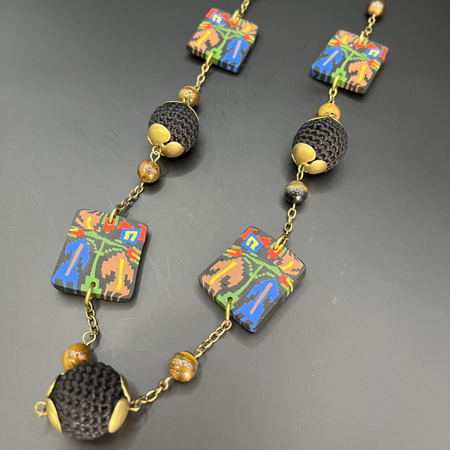 Collier statement inspiré de motifs traditionnels, réinterprétés dans une vision moderne. Les éléments carrés en pâte polymère Fimo, ornés de symboles stylisés de « l’Arbre de Vie », s’harmonisent avec des perles crochetées et des pierres d’œil de tigre aux reflets chauds.