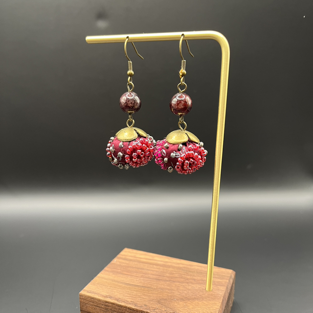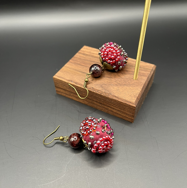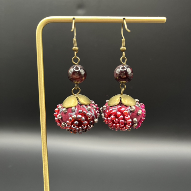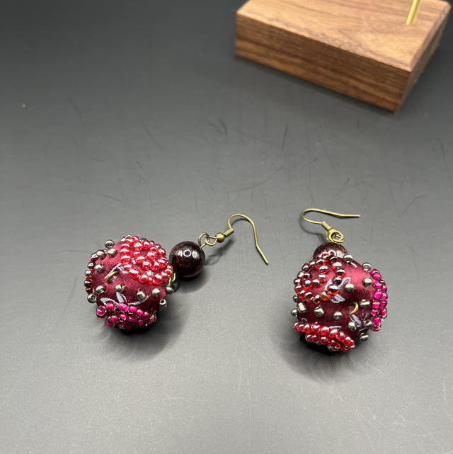 Boucles d’oreilles artisanales uniques, réalisées à la main, inspirées par la forme et la symbolique de la grenade — fruit de la féminité, de la vitalité et de l’abondance. L’élément central est conçu en tissu textile brodé à la main avec de fines perles, cousues une à une, offrant profondeur, texture et une subtile brillance.