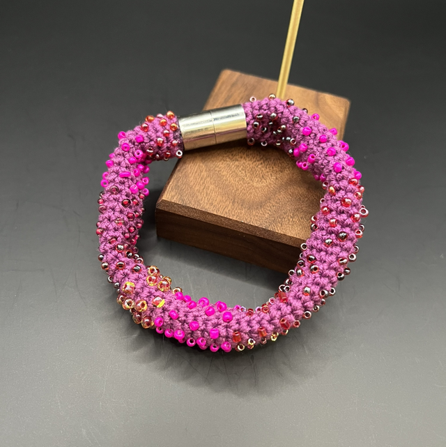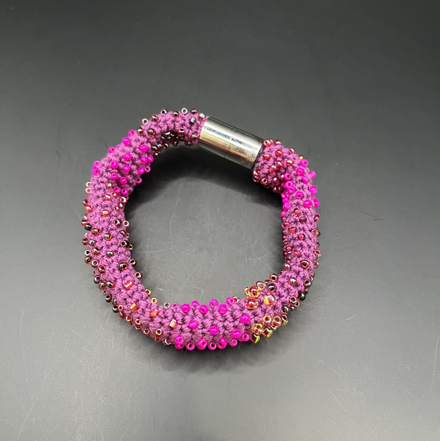 Bracelet crocheté à la main avec un fil de coton, orné de petites perles cousues une à une. Il est assemblé avec un fermoir magnétique, offrant une utilisation facile et pratique. Longueur : 21 cm.
