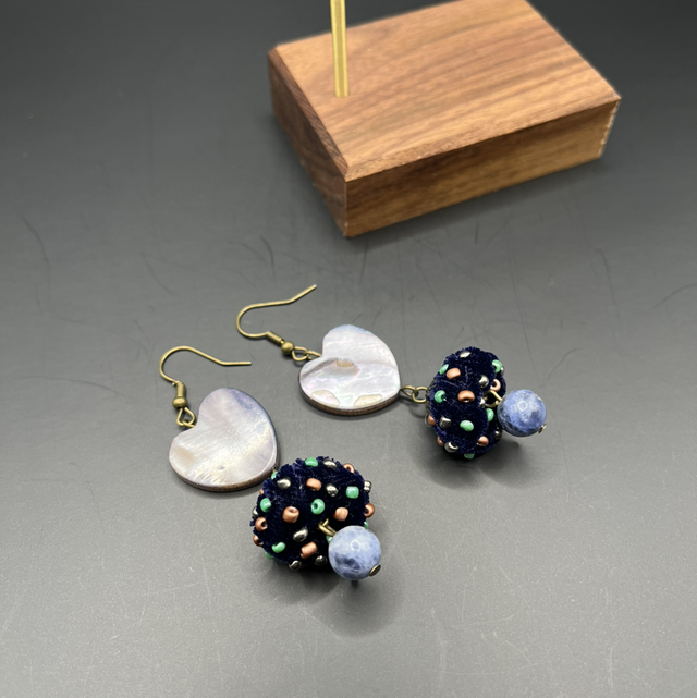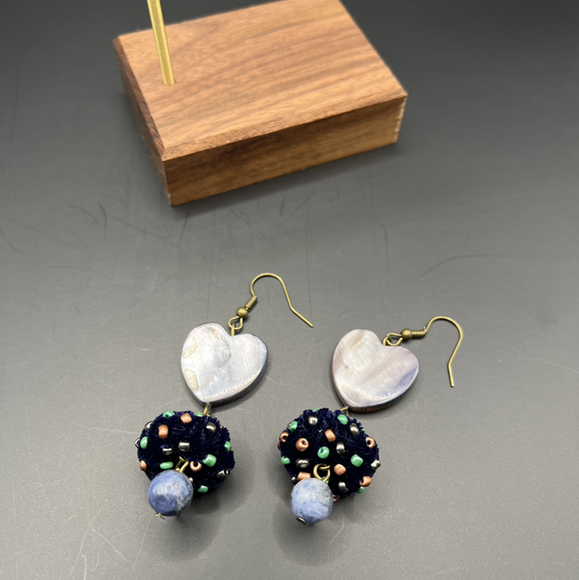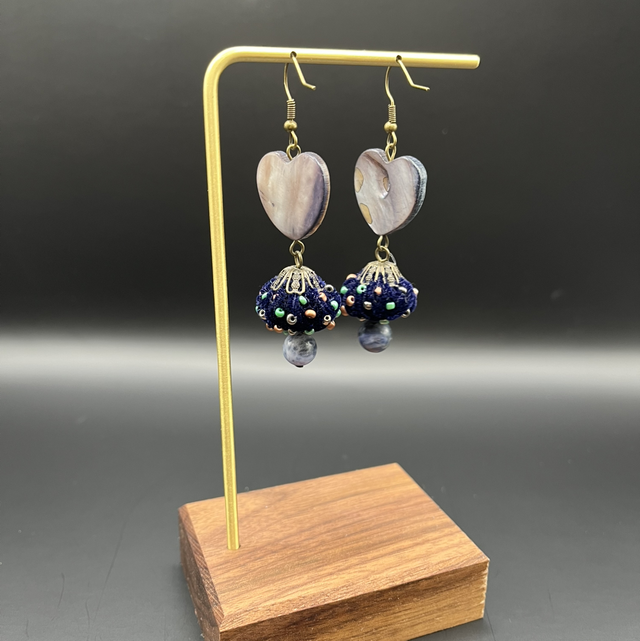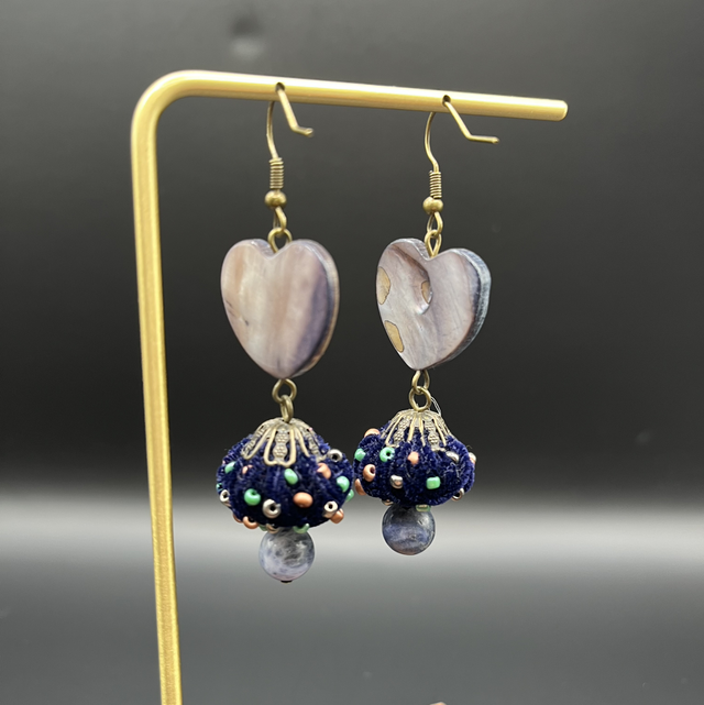 Boucles d’oreilles artisanales uniques, réalisées à la main, alliant harmonieusement textures et matériaux naturels. La partie supérieure est ornée d’éléments en nacre naturelle en forme de cœur, aux reflets délicats et élégants.