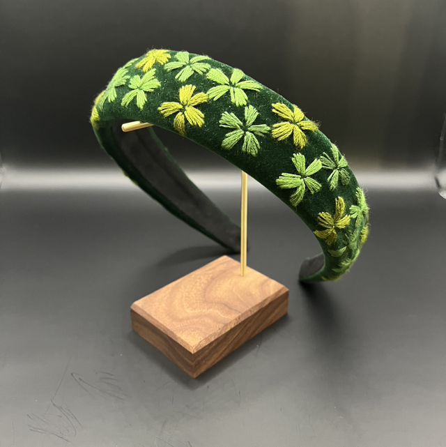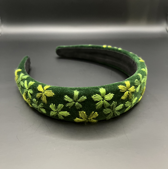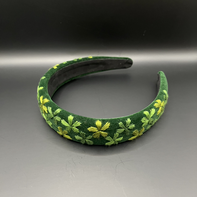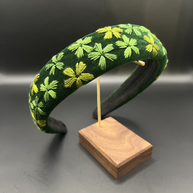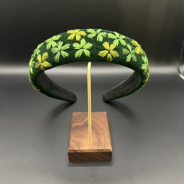 Serre-tête en velours verte, brodé à la main avec du fil de coton
